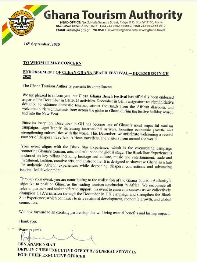Endorsements letter by the Ghana Tourism Authority for 3rd edition clean Ghana beach festival